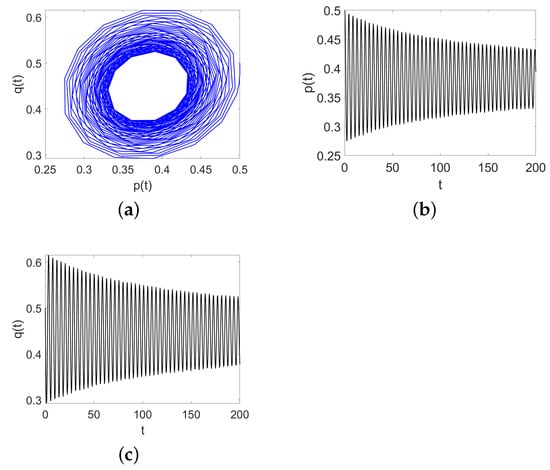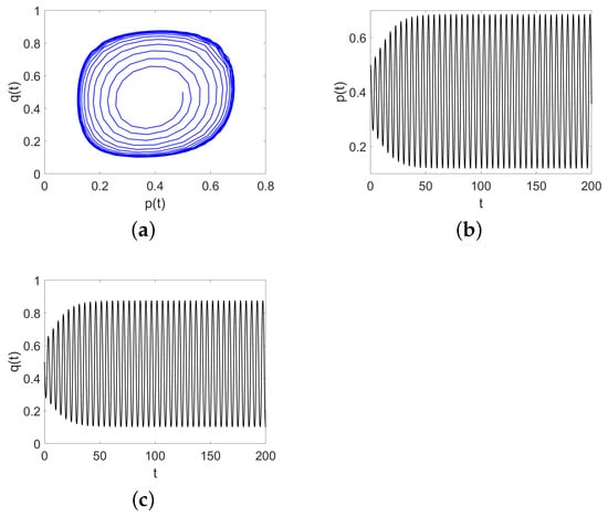 (a) Evolution curve of System (9) when ; (b) The evolution progress of p as t changes; (c) The evolution progress of q as t changes.