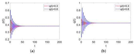 (a) The evolution process of p as t changes when q is set to 0.3 and 0.8; (b) The evolution process of q as t changes when p is set to 0.3 and 0.8.