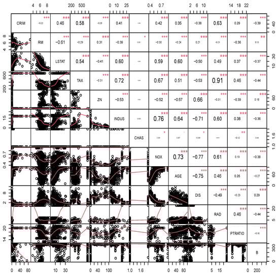 Figure 1 displays a colored plot of the correlation coefficients for each variable. The notation (***) indicates high significance with a p-value of less than 0.001. The notation (**) indicates significance at a 1% level, while (*) indicates significance at a 5% level. If none of these symbols are present, it signifies that the correlation coefficient between the two variables is not statistically significant. The CMEDV and a few other factors have a strong linear relationship, as seen in the plot. This plot is useful for examining the strength of linearity between the original response CMEDV and any other variable if it exists. The selected variables by the adaptive LASSO algorithm appear to have strong, medium, and weak relationships with the response variable. Moreover, some variables exhibit collinearity; this issue will show how ridge-type estimators show high performance compared to MLE estimators.