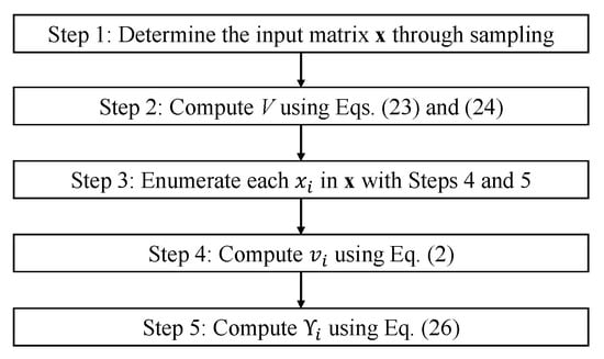 As shown in Figure 1, the derivative-variance hybrid global sensitivity measure can be computed using the following steps: (1) sample the input matrix x; (2) compute the total variance V using Equations (23) and (24); (3) enumerate each input xi with Steps 4 and 5; (4) compute the derivative-based global sensitivity measure vi using Equation (2); and (5) compute the derivative-variance hybrid global sensitivity measure ϒi using Equation (26).