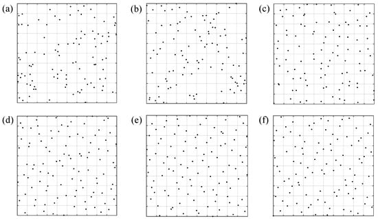 One realization obtained using different sampling methods: (a) Monte Carlo sampling, (b) Latin hypercube sampling, (c) stratified sampling, (d) Latinized stratified sampling, (e) quasi-Monte Carlo sampling using Sobol sequence, and (f) quasi-Monte Carlo sampling using Halton sequence.