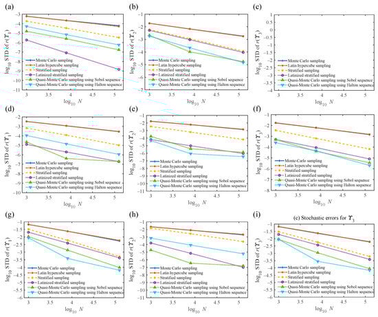 Standard deviations of relative errors produced using different sampling methods: (a) ϒ1 of Example 1, (b) ϒ2 of Example 1, (c) ϒ3 of Example 1, (d) ϒ1 of Example 2, (e) ϒ2 of Example 2, (f) ϒ3 of Example 2, (g) ϒ1 of Example 3, (h) ϒ2 of Example 3, and (i) ϒ3 of Example 3.