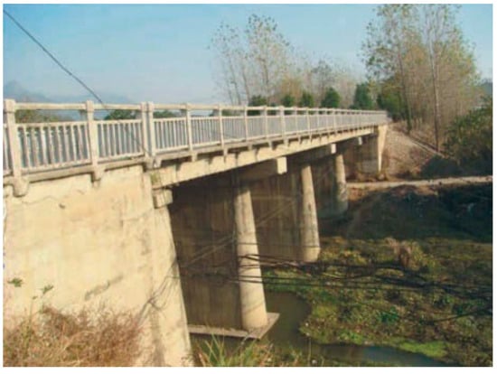 In order to demonstrate its validity and practicability, the proposed sensitivity measure is applied to the sensitivity analysis of a rural bridge. The bridge, located in the Xinzhou district (Wuhan city, Hubei Province, China), is a solid plate bridge with a span-combination of 4 × 6 m, whose width equals 10 m (shown in Figure 4). Each span consists of 10 solid plates of 0.99 m wide.