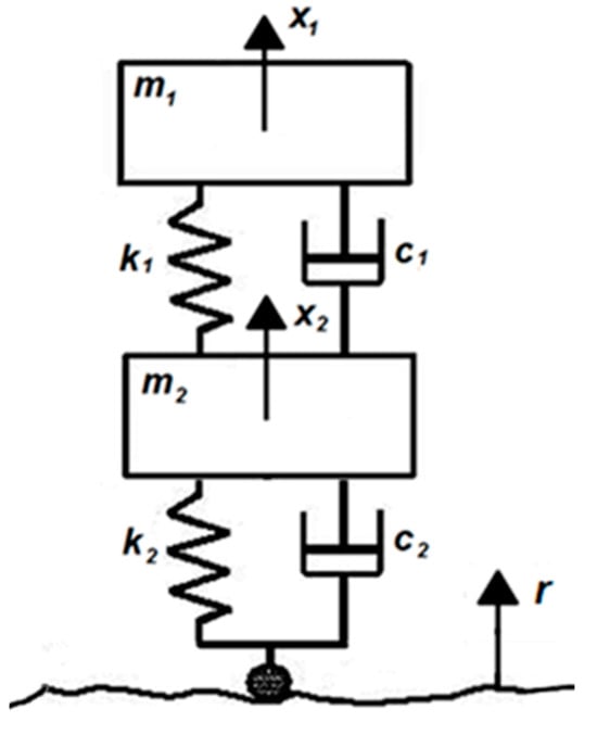 One of the simplest systems for the representation of the independent suspension of a quarter-vehicle model is the model with two degrees of freedom (Figure 2). In this model, two masses are considered. One that is suspended and corresponds to the vehicle’s bodywork (m1) and another one for the unsprung mass, which simulates the tire and part of the suspension elements (m2). Moreover, the rigidity and the damping coefficient of the suspension system appear as, (k1) and (c1), respectively. The unsprung mass rigidity (k2) and its damping (c2) are considered, which simulates the tire behavior. These are, therefore, the parameters of the model, the mases m1 and m2, the damping coefficients of the suspension system and the unsprung mass, c1 and c2, and their corresponding rigidities, k1 and k2. This model allows for the study of the movements of the suspended mass as a function of the unsprung mass, the tire rigidity, the rigidity of the suspension spring, and the characteristic of the damping element.