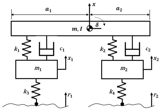 The quarter-vehicle model is perfect for examination and optimization of the vertical movement of the masses. However, this model can be extended to half of the vehicle including a wheel on each axis (known as the bicycle model). Thanks to this representation, the pitching of the suspended mass can be analyzed (Figure 3).