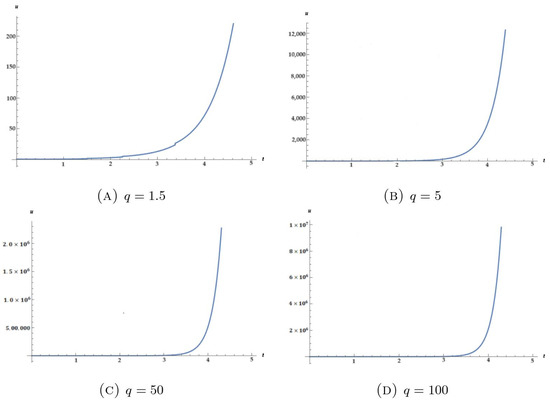 We have assumed specific values of q in accordance with the requirements of quantum calculus, and we have examined the boundedness of the solution in each of these scenarios. We derive from the plots in the Figure 2 that does not take an undefined value for any of the values of q. This demonstrates that for every q, Equation (42) does not reach a blow. Thus, for any q and τ in , the solution of (42) is bounded. Furthermore, we may determine that the boundedness of the solution relies on the time scale under consideration by comparing the blow-up analyses of Examples 1 and 2.