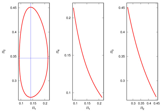 Using Equation (16) (see also the left panel of Figure 1), we can derive the domain of by looking at the values of the strategy frequencies for which . This divergence happens at , and by inserting this value in Equation (16), we obtain a quadratic equation for the extreme values of ,