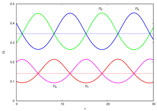 A closed trajectory in the four-dimensional space of strategy frequencies implies periodic solutions in for in Equations (10)–(13). The initial conditions, , determine the constants A and B in Equations (14)–(16) and thus the phase trajectory in Figure 1. The corresponding periodic solutions are shown in Figure 2.