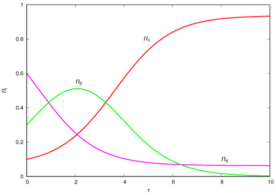Moreover, since , we have . In this scenario (i.e., for ), Equations (10) and (13) indicate that increases and decreases with . In fact, the short-lived presence of strategy 2, i.e., telling the truth and not believing, increases the payoff of strategy 1, i.e., telling the truth and believing, but decreases the payoff of strategy 4, i.e., , which always fails to predict the true outcome of the coin toss announced by the players using the other strategies. Figure 4 illustrates the time evolution of the non-zero strategy frequencies in this scenario. Note that the fixed point is neutral: an arbitrary perturbation to , , and leads to different value of B and thus to a different fixed point.
