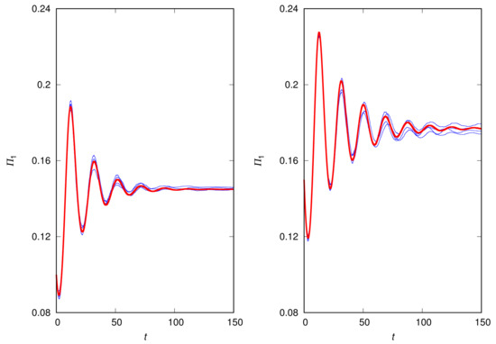 Time evolution of the strategy frequency for N = 20,000 and different initial conditions. (Left) , , , and , which leads to and . (Right) , , , and , which leads to and . The parameters of the payoff matrix are , , and . The thick red curves are the solutions of the replicator equation, and the thin blue curves are runs of the stochastic imitation dynamics.