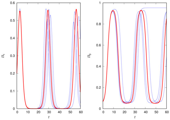 Periodic solutions for the strategy frequencies for the initial conditions , , and , corresponding to and . The thin horizontal blue and red lines are and , respectively.