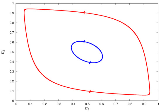 Trajectories in the phase plane showing the frequency of truth tellers and the frequency of believers for and (blue curve) and and (red curve) in an infinite population. The parameters A and B are determined by the initial conditions according to Equations (14) and (15), respectively. The trajectories are counterclockwise, as indicated.