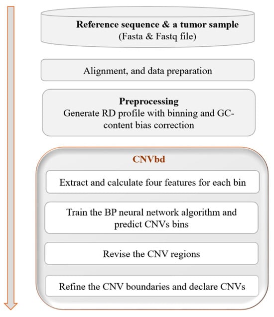 CNVbd is based on the RD approach, which does not require a control-matched sample. The flowchart of CNVbd is illustrated in Figure 1. Firstly, a sequenced sample (i.e., a Fastq file) is aligned to the reference sequence (i.e., an Hg38 Fasta file) by BWA [29], which is currently one of the most popular alignment tools. This process produces the SAM/BAM file, through which the RC profile is generated with SAMtools [30]. The RC values of the value-lost and “N” positions are filled with zeros to obtain a complete and workable RC profile. Then, an RD profile is generated by dividing the complete RC profile into bins and performing a GC bias correction process. With the RD profile, CNVbd begins to detect CNVs through four steps. In the first step, four CNV-related features are extracted or calculated. In the second step, the BP neural network algorithm is trained based on the four features to predict the gain or loss CNV bins. In the third step, a designed revision process is applied to certain CNV regions. In the last step, a boundary search algorithm is implemented to refine the CNV boundaries, and all CNVs are finally declared. The CNVbd program is written in Python and is freely available at https://github.com/BDanalysis/CNVbd, accessed on 8 May 2023. This software is easy to install and configure. Please refer to the above website for the specific usage and requirements of this method. The principle and implementation for each of the steps are described in detail in the following subsections.