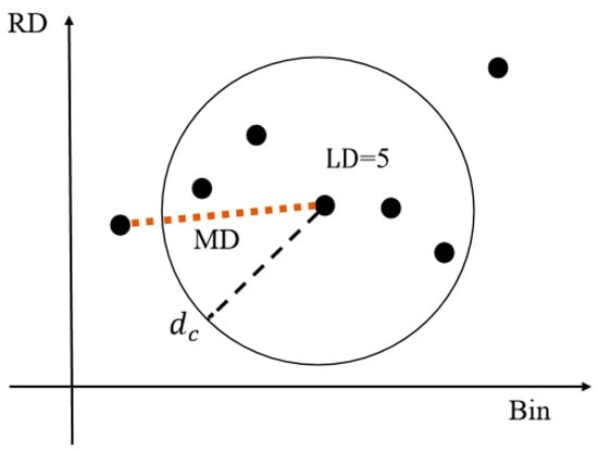 The LD and MD are two quantities introduced and mainly used in clustering by fast search and find of density peaks [32] for outlier detection. The local density is equal to the number of points that are within a cutoff distance of the i-th bin point, calculated using Equation (2):