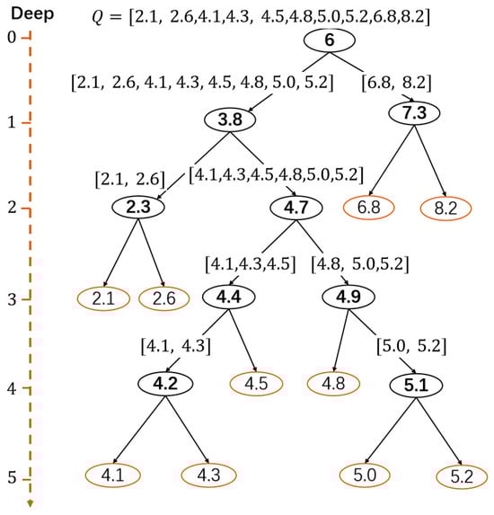 An isolated forest is a collection of isolated trees (iTrees). Each iTree is a binary tree classifier, with every leaf being a class, which is trained by Algorithm 1 and can be referred to [26]. The deep level of a value in an iTree is defined as the path length from the root to the leaf that the value belongs to. For a clear understanding of Algorithm 1, an example of training an iTree on a set of ten values is presented in Figure 3, where the bold numbers are the randomly selected values following step (3).