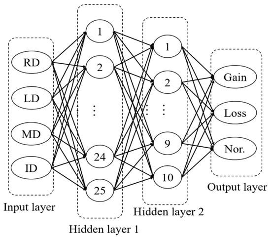 With the four features, we predicted the CNV bins by training the BP neural network algorithm [33]. The BP neural network is a well-known method of training a multilayer feedforward neural network and is applied to many fields due to its simple topology and good learning ability. It consists of three types of layers: input, hidden, and output. The core idea of the algorithm is that it adjusts the weights between neurons through back propagation, which continuously reduces errors and thus optimizes output. Here, the BP neural network we use contains four layers: one input, two hidden, and one output, as shown in Figure 4. The input layer consists of 4 neurons corresponding to the 4 features. The two hidden layers consist of 25 neurons and 10 neurons, respectively, according to our extensive testing. The parameters of the architecture were determined by extensive testing. The number of hidden layers was tested from 1 to 5, and it turned out that two hidden layers were enough to accomplish the classification task and did not cause overfitting. All the combinations of the number of neurons in the two layers from the set {5, 10, 15, 20, 25, 30} are tested, and (25, 10) works best. For the hidden layers, we used the Rectified Linear Unit (ReLU) function [34] as their activation function (Equation (5)) for good stability and fast convergence. As for the output layer, we used the Softmax function as its activation function (Equation (6)), which can effectively display the multi-classification results in the form of probability.