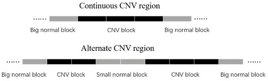 In this section, we design a revision process to reduce the false negatives, trying to pick up the local signals that could not be captured by the prediction model, especially for data with low sequencing coverage. The previous step predicted each bin in the form of gain, loss, or normal. A segment of continuous gain, loss, or normal bins is called a gain, loss, or normal block, respectively. A normal block consisting of at least ten bins is regarded as big; otherwise, it is small. Now we can divide the sample sequence into CNV regions by big normal blocks. The CNV regions are classified into two categories: the continuous type, which is entirely a CNV block, and the alternate type, which consists of CNV blocks and small normal blocks, as shown in Figure 5. The revision process aims at the alternate CNV regions with a proportion of CNV bins above a certain level because false predictions exist with a higher possibility in these regions than in the continuous ones.
