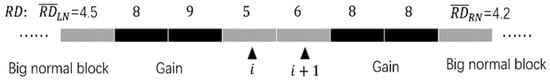 In the revision process, each normal bin will be compared with its nearby bins, since adjacent bins across the genome are usually positionally correlated from the perspective of copy number [5,35]. The revision process is implemented on an alternate CNV region when the proportion of CNV bins is greater than the threshold . For each CNV block in a region, the revision process runs over normal bins, first on the left side, then on the right side, from near to far. For each CNV block, denote by and the left and right base values, respectively, calculated by Equations (7) and (8):