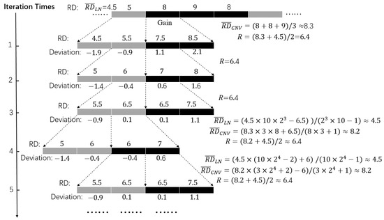 As for searching the right boundary of a gain block, the algorithm is only different in step (3) in that the bin-choosing order is from left to right. With regard to a loss region, the BDS algorithm needs only to switch the positive and negative deviation conditions in step (3). For a better understanding of Algorithm 3, please see an example for the left boundary search of a gain block, as shown in Figure 7, where the first five iterations are presented. The values of , , and are recalculated during the third and fourth iterations. After the boundaries are refined, CNVs can be declared.