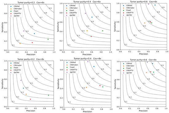 The comparative results of all five methods are illustrated in Figure 8, where the average values of precision, sensitivity, and F1 score (black curves) in different scenarios are presented. Here, one true positive is counted when it covers at least half of the region of one real CNV. We can observe that the efficiency of almost all the methods improves generally with the increase in tumor purity or coverage depth (Cov). For instance, the F1 score of the CNVbd method increases from around 0.4 to more than 0.8 when the tumor purity rises from 0.2 to 0.6. In terms of precision, the CNVbd obtains the top spot in one of the six simulation scenarios and ranks second inferior to the FREEC in three scenarios. In terms of recall, CNVbd is second only to CNVnator in all the simulation scenarios, followed by FREEC, CNV_IFTV, and dpCNV with their respective strong points. However, CNVbd yields the largest F1 score in five simulation configurations. As a summary of the above analysis and discussion, it is evident that CNVbd exhibits the best trade-off between precision and recall and shows stable performance in the detection of CNVs.