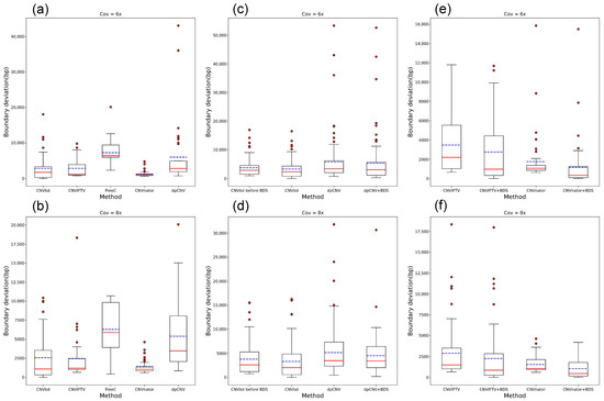 Boundary deviation comparison between the CNVbd method and the four peer methods before and after the applications of the BDS algorithm. (a,b) The boundary deviation comparison between the five methods. (c–f) The boundary deviation comparison between the five methods before and after the applications of the BDS algorithm.
