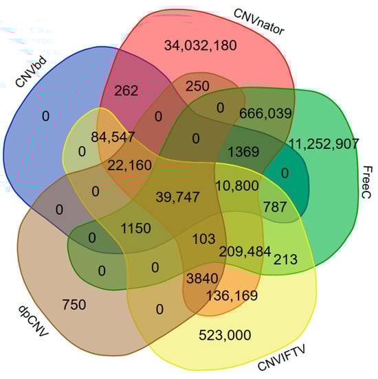 CNVnator retrieves the largest number of overlapping events in all three samples, but it also predicts the most non-overlapping events. Although CNVbd detects a slightly lower number of overlapping events than CNVnator, it detects zero non-overlapping events from two samples. FREEC detects a moderate number of overlapping events, and dpCNV obtains the least number of overlapping events in each sample. The overlapping events between the five methods performed on the lung cancer sample are described in Figure 10. The ODSs of the five methods for each sample are calculated and displayed in Table 2. For the purpose of controlling the ODS in order of magnitude, the length unit of CNVs is set to be kb (kilobase, i.e., 1000 bp). CNVbd obtains the top ODS on the lung cancer sample and the second largest ODS on the two ovarian cancer samples, while it wins by the average ODS over the three samples. This indicates that CNVbd shows stable performance and superior consistency with other methods.