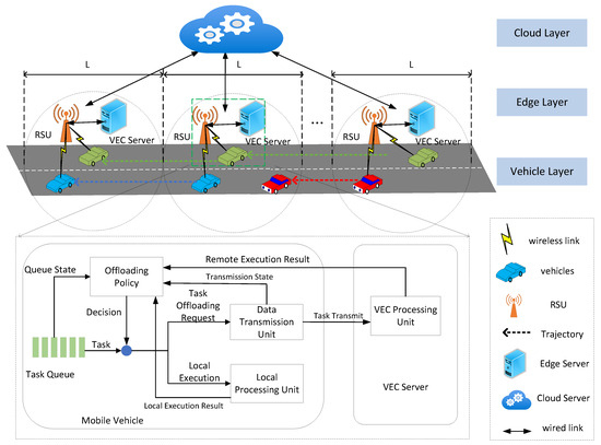 In this research, we examine a tri-layered edge-cloud collaborative system architecture for Telematics, as illustrated in Figure 1. Within the Vehicular Edge Computing (VEC) framework, vehicles function as dynamic nodes of distributed computing, the vehicle side generates a large number of computing tasks in real time, including perception tasks, decision-making and planning tasks, vehicle control tasks, and data transmission tasks. Some of these computing tasks require a large amount of computing resources, such as target detection and lane detection, traffic signal recognition, path planning, etc.Road-Side Units (RSUs), distributed throughout the urban infrastructure, play a pivotal role in processing vehicular data, orchestrating computational offloading and caching strategies, and delivering essential services, including video transmission and traffic management. In this framework, each RSU is equipped with an edge computing server to handle computational tasks. It’s important to note that each edge computing server associated with the RSUs has a service radius denoted by ‘L’ defining the geographical scope within which it provides its computational and communication services. The cloud layer, equipped with expansive computing and storage resources, oversees data from mobile nodes and edge servers, providing centralized governance and strategic decision-making. This “Cloud–Edge–End” architectural model adeptly caters to a variety of edge computing and communication requirements, offering efficient and dependable services.