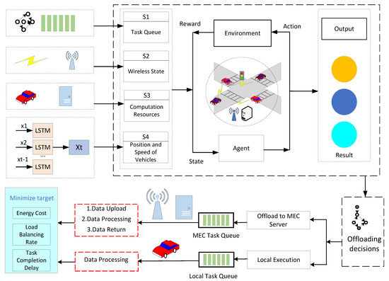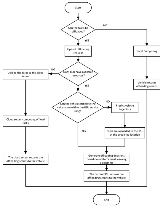 First, when a computational task from a vehicle arrives, an assessment is made regarding the offloading feasibility of the task. Tasks sensitive to high latency, such as those involving control of vehicle direction or acceleration, cannot be offloaded and must be completed locally to avoid catastrophic consequences. If the vehicle’s computational task is suitable for offloading, an offloading request is submitted. The current Roadside Unit (RSU) is checked for available computing resources. If the current RSU lacks sufficient computing resources, the task is sent to a cloud server for offloading. The cloud server performs the offloading task, and upon completion, the offloading results are returned to the vehicle. If the current RSU has sufficient computing resources, the dwell time of the vehicle within the current RSU’s service range is calculated. If the vehicle can complete the offloading within this range, an offloading decision is generated using a reinforcement learning algorithm, and the current RSU returns the offloading results to the vehicle. If the vehicle cannot complete the offloading within the current RSU’s service range, the Long Short-Term Memory (LSTM) algorithm is utilized to predict the vehicle’s trajectory. Based on the predicted location of the vehicle at the next time step, the computational task is sent to the RSU server at that location. Within the service range of the predicted RSU, an offloading decision is generated using reinforcement learning, and the final decision is returned to the vehicle.