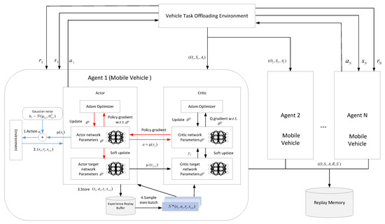 Firstly, we transform the system utility maximization objective into a reward maximization challenge. This is accomplished by employing a multi-agent variation of the Markov Decision Process, termed the Markov Game, denoted by the tuple . This approach treats each vehicle as an intelligent agent, which hones its optimal strategy by observing the L-MADRL environment and collaborating to maximize overall system utility. We then define the fleet of mobile vehicles as . Moreover, is designed as the set of states, represents the agents’ action repertoire, and constitutes a sequence of observations available to the agents. Given that the collaborative L-MADRL scheme operates within discrete, equal, and non-overlapping time slots, and assuming consistent communication parameters within each time slot T, we establish the tuple for each time slot T accordingly. Figure 5 illustrates the framework for solving the computational offloading problem based on the MADDPG algorithm.