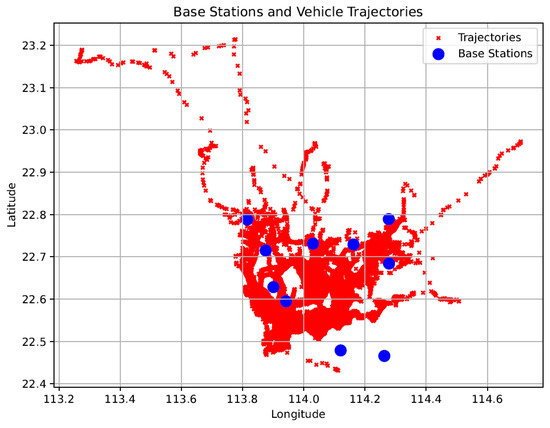 The experimental simulation setup is visually depicted in Figure 6, where the vehicle’s trajectory position information is marked in red, and the randomly generated base station information is highlighted in blue.