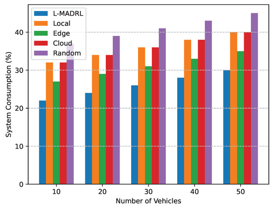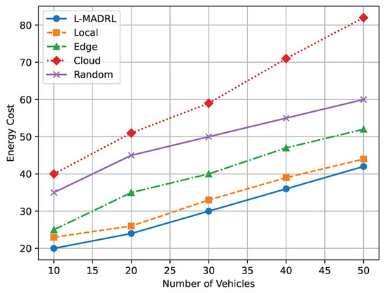 Figure 11 presents the average energy consumption of various processing algorithms across different numbers of vehicles. The Local algorithm maintains low energy consumption by processing tasks directly at the vehicle terminals, eliminating the need for task transfer. However, the system’s average energy consumption increases with a higher number of vehicles. The L-MADRL algorithm excels in energy efficiency, significantly reducing average energy use by adapting to vehicle trajectories and edge server loads. This is a result of its optimized task offloading and resource allocation strategies, tailored to specific vehicle paths and server load dynamics.