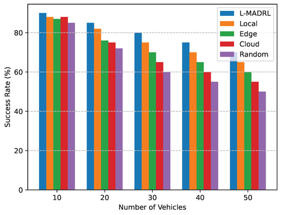 The relationship between the number of vehicles and their average completion rate is illustrated in Figure 9. While the advantages of the L-MADRL algorithm may not be highly pronounced with a smaller vehicle count, its effectiveness becomes increasingly apparent as the number of vehicles rises. In contrast, the Local algorithm, when dealing with a large number of vehicles, faces substantial local computational strain, resulting in a diminished number of completed tasks within the specified timeframe. Simultaneously, both the Edge and Cloud algorithms encounter heightened transmission delays due to the increased vehicle count, leading to elevated network congestion and a subsequent decline in the timely completion of tasks. Conversely, the L-MADRL algorithm adeptly handles task offloading to RSUs even under heavy task loads, thus maintaining a high and stable task completion rate.