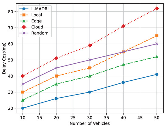 Figure 10 illustrates the average processing latency across different methods for varying numbers of vehicles. A noticeable trend is the increase in processing latency corresponding to the growing workload in each region. In this context, the L-MADRL algorithm stands out by providing the lowest latency regardless of the number of vehicles. Conversely, the Cloud algorithm records the highest average processing latency, primarily due to significant transmission delays over wireless links when offloading computational tasks to the cloud server. Meanwhile, the stochastic computing algorithm’s average processing delay exhibits a degree of randomness, depending on the prevailing network conditions. Lower latency is observed under favorable scenarios, while higher latency is noted in poorer conditions.