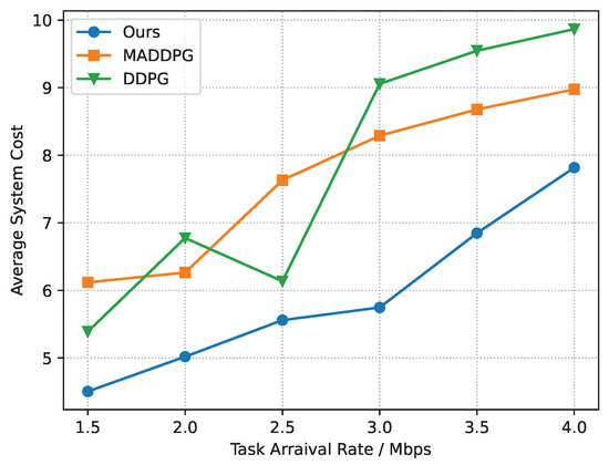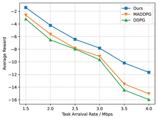 Concerning algorithmic comparison, we compare our proposed algorithm with DDPG and MADDPG algorithms. DDPG is a conventional algorithm for task offloading and resource allocation, while MADDPG is a multi-agent reinforcement learning algorithm. Through this comparative analysis, we acquire a comprehensive understanding of the superiority of our algorithm under varying load conditions, offering valuable insights for system design and optimization. Figure 12 and Figure 13 respectively show the changes in system energy consumption and average reward as the vehicle task arrival ratio changes. The experimental results prove that our proposed algorithm significantly reduces system energy consumption and system average reward.