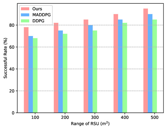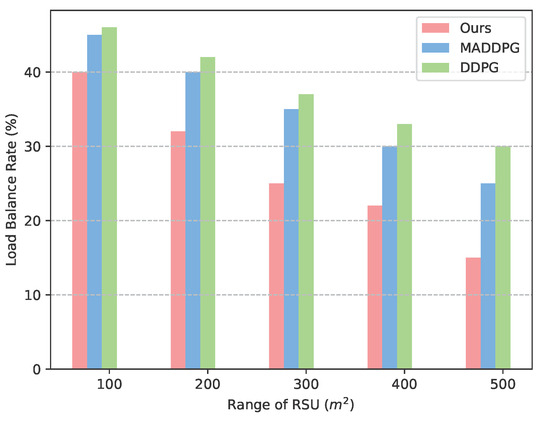 In this experiment, we systematically investigate the impact of varying RSU coverage ranges on load balancing and task success offloading rates. The experiment is designed to compare the performance of our proposed algorithm with DDPG and MADDPG algorithms under different RSU coverage scenarios. Figure 14 and Figure 15 respectively depict the variations in load balancing rate and task success completion rate of edge servers with the changing coverage range. Experimental results demonstrate that our proposed algorithm achieves a more balanced complexity and enhances the success completion rate of tasks compared to other algorithms.