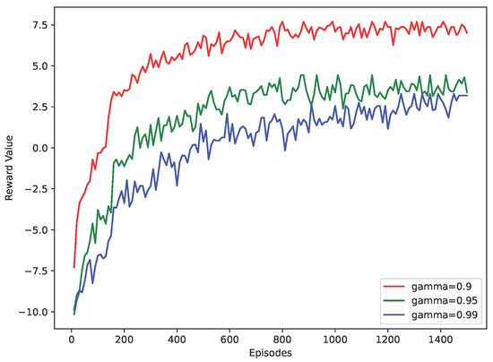 In Figure 16, the experiment delves into the impact of varying discount factors on the experimental reward values. We set three distinct discount factors—0.9, 0.95, and 0.99—and conducted multiple training and testing sessions on a consistent reinforcement learning task to evaluate their effects. The results clearly indicate that the discount factor significantly influences the reinforcement learning task’s performance. With a discount factor of 0.9, the agent registers the highest cumulative reward values.When the discount factors are set to 0.95 and 0.99, there is a marginal decline in the agent’s performance. Although these higher discount factors still account for future rewards, they may, in this specific task, cause the agent to overly prioritize long-term returns. This could potentially slow down the learning process and affect the stability of the learning outcomes.
