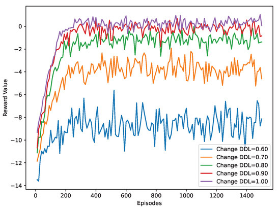 Initially, the experiment focusing on the variation in task completion deadlines demonstrated a significant influence of the cutoff time on system performance. A trend was observed where a shorter task deadline led to a gradual decrease in the overall system reward, with the steepest decline noted at 0.6 s. This trend indicates that stringent time constraints for completing computational tasks necessitate heightened real-time processing capabilities, subsequently impacting the success rate of task execution and diminishing the overall system reward. Conversely, extending the task deadline allows for a progressive increase in the system reward, suggesting ample time for task processing and an enhanced success rate. The system reward stabilizes at a 1-s deadline, indicating an optimal balance between real-time performance and task completion success within this timeframe.