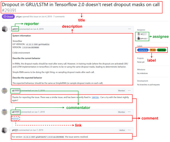 In this paper, we study the software defects in the Issue-Tracking System. Take the software defect of No. 29391 (https://github.com/tensorflow/tensorflow/issues/29391, (accessed on 14 December 2023)) in the project tensorflow/tensorflow as an example, and its basic structure is shown in Figure 1.