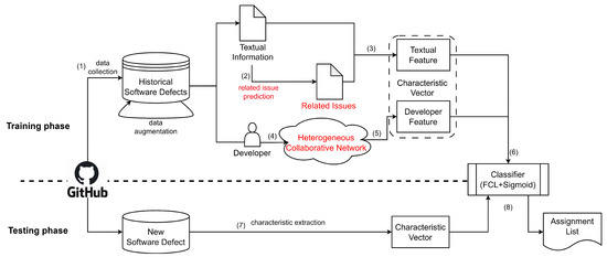 In the training phase, this paper first collects software defects from the GitHub platform and the developers. Then, potentially related issues are predicted for software defects, and text features are calculated comprehensively. At the same time, a heterogeneous collaborative network is constructed based on three development behaviors of developers: reporting, commenting, and fixing. The graph-embedding algorithm is used to learn the feature representation of developers. Finally, the feature vectors of software defects are input to the classifier for training and learning, and the developer assignment model is obtained.