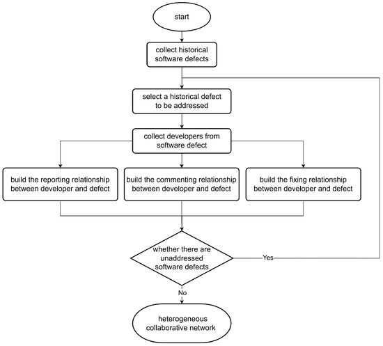 The definition of a heterogeneous collaborative network is shown in Table 1. The flowchart for constructing a heterogeneous collaborative network for a software defect is shown in Figure 3. First, we collect all historical software defects. Second, we select a software defect to be addressed from the historical software defects. Third, we collect the developers from the software defect, including reporter, commentator, and fixer. Fourth, we construct the reporting relationship, the commenting relationship, and the fixing relationship between developers and software defects, respectively. Fifth, we determine whether there are any software defects to be addressed. If so, go back to the second step. If not, it indicates that all software defects have been handled and the final heterogeneous collaborative network is output.