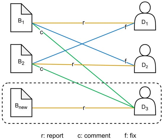 In heterogeneous collaborative networks, the node types include software defects and developers, and the edge types include developers’ reporting behavior, commenting behavior, and fixing behavior. We represent a software defect as B (also known as Bug), a Developer as D, a reporting behavior as r, a commenting behavior as c, and a fixing behavior as f. An example of a heterogeneous collaborative network is shown in Figure 4, where is the newly reported software defect, developer is the reporter of the software defect, and belong to the historical software defects, and and are the developers involved. At the same time, developer also participated in commenting on historical software defect and historical software defect . So far, the DARIP method has obtained a heterogeneous collaborative network built for software defect .