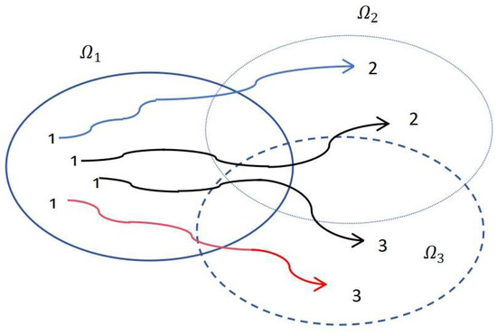Firstly, from Figure 1, we can see that the pulse moment and the switching moment do not occur simultaneously. That is, the state transition curve does not exhibit a pulse burst shape. The dynamic indications caused by the pulse only show significant changes around the switching points. Secondly, the idea of state-dependent switching can be briefly described in Figure 1. The solutions initiate from different initial points within mode 1 (). Subsequently, upon reaching the boundary of mode 1, where it intersects exclusively with mode 2 (), the system transitions to mode 2, as illustrated by the blue curve in Figure 1. Similarly, when reaching the boundary of mode 1 that intersects exclusively with mode 3 (), the system switches to mode 3, represented by the red curve in Figure 1. Lastly, upon reaching the boundary of mode 1, which intersects with both mode 2 and mode 3, the system undergoes a switch to the mode determined by the minimum of law (8), as depicted by the black curve in Figure 1.