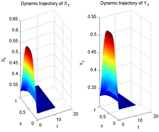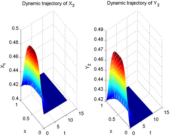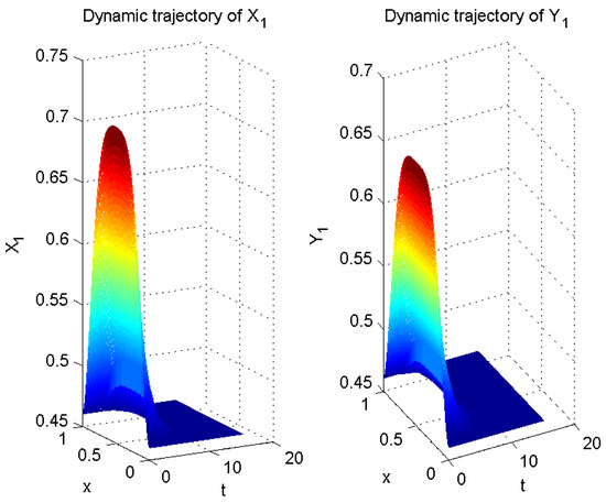 The switching rule of Theorem 1 is different from the switching rule in reference [18]. Meanwhile, synchronization control results for epidemic models have been achieved using impulse control. This is the first time that synchronization control has been obtained for a reaction–diffusion epidemic model under a switching rule.