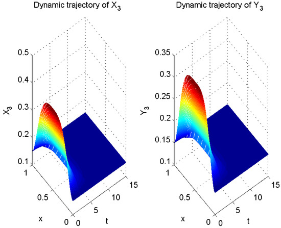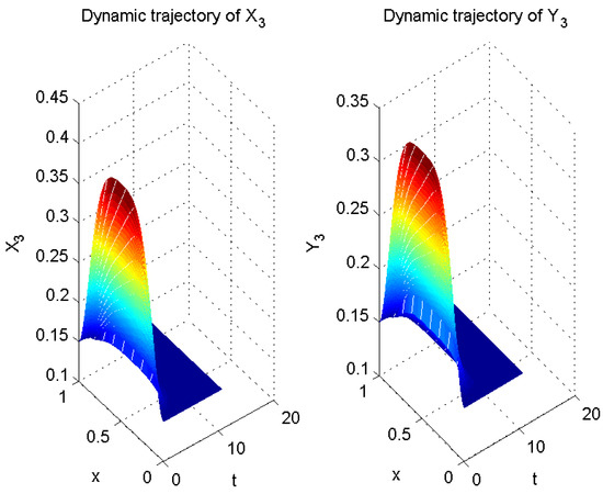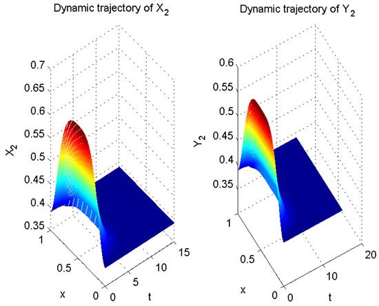 Thus far, all conditions of Theorem 1 have been satisfied. Therefore, according to Theorem 1, error system (6) is globally exponentially stable with a convergence rate of . In other words, system (5) is globally exponentially asymptotically synchronized with system (3), and its synchronization rate is (see Figure 2, Figure 3 and Figure 4).