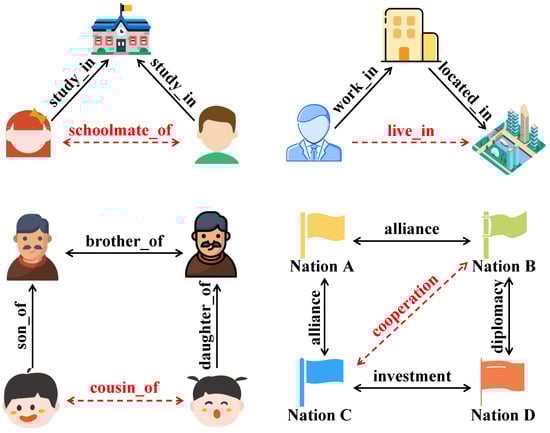 Knowledge graphs (KGs) are instrumental in various intelligence applications, including recommendation systems [1,2], information retrieval [3,4], and question answering [5,6]. To facilitate these knowledge-driven applications, numerous types of KGs have been developed in the past decades. KGs comprise structured human-understandable knowledge, typically represented as triplets [7]. Each triplet, denoted as , comprises a head entity , a tail entity , and a relation r. By leveraging this structured representation, KGs can be represented as multi-relation graphs, with entities acting as nodes and relations serving as edges [8]. This graphical representation facilitates the exploration and analysis of interconnections and semantic relationships within the knowledge domain, enabling sophisticated knowledge-driven applications to leverage the rich information network within KGs [9].