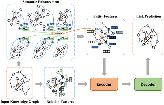 An overview of SE-KGC. First, the input knowledge graph is supplied to the model, where entities undergo semantic enhancement to extract refined features while relation features are obtained directly. Subsequently, these extracted features are then fed into the encoder for subsequent processing. Finally, the decoder effectively utilizes the encoded features for accurate link prediction.