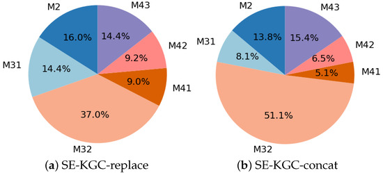As shown in Figure 3, both SE-KGC-replace and SE-KGC-concat exhibit a similar distribution of the learned weights of the six motifs in the WN18RR dataset. Motifs and occupy the top two highest proportions in two SE-KGC variants, which can be explained by semantic patterns given by structures of motifs. Structurally, motifs and connect every entity to all other entities in the graph. Semantic patterns behind these two structures imply that entities with the same neighbors probably also have relations. This observation highlights the semantic patterns ingrained within the structures of these motifs, reinforcing the importance of considering such patterns in link-prediction tasks.