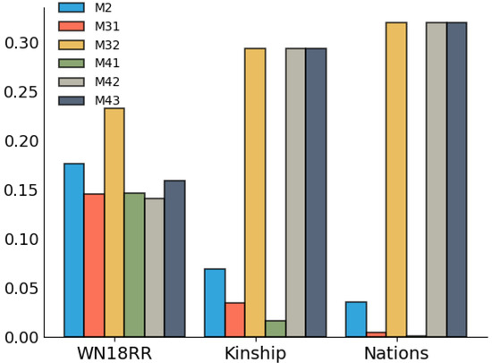 We can also obtain the distribution of the SE-KGC-attention model from Figure 4. For third-order motifs, holds greater significance compared to . Similarly, in the case of fourth-order motifs, exhibits higher importance than , and likewise, surpasses in significance. This observation can be attributed to the semantic patterns determined by the motifs. The patterns can be explained by the fact that entities with higher connectivity tend to play a more crucial role in characterizing semantic information. We show the effectiveness of semantic enhancement guided by motifs, and different motif structures stand for various semantic patterns.