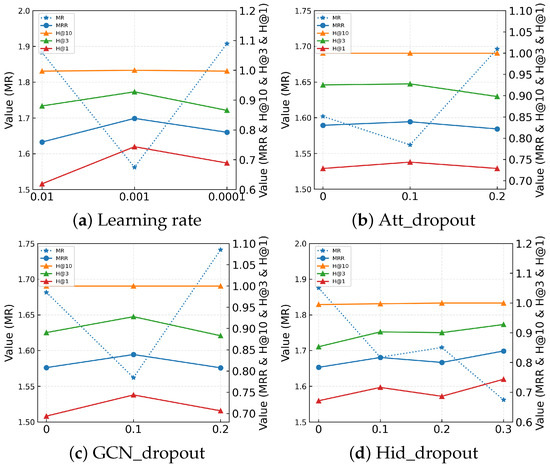 Attention dropout, GCN dropout, and hidden dropout are regularization techniques widely employed in deep learning to mitigate the problem of overfitting. These techniques play a crucial role in improving the generalization capability of models. Attention dropout sets a proportion of attention weights to zero during training to reduce the model’s reliance on specific attention areas and improve generalization. Hidden dropout randomly drops out neurons during training. This dropout scheme reduces the model’s dependence on specific features and promotes robustness by encouraging the remaining neurons to collectively contribute to the learning process. GCN dropout operates on the adjacency matrix of graph data during training to reduce dependence on certain nodes or edges and improve generalization. This regularization technique enhances the generalization capability of graph convolutional networks by encouraging the model to consider a wider range of node and edge relationships. These techniques are important for preventing overfitting and improving generalization in deep learning models. The experimental results, depicted in Figure 5b–d, confirm the effectiveness of these techniques. Notably, the optimal experimental results are obtained when att_dropout is and set to , GCN_dropout is set to , and hid_dropout is set to .