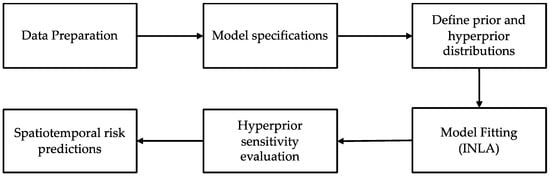 The construction of the spatiotemporal model, along with the selection of priors and hyperprior distributions for predicting spatiotemporal relative risk, can be elucidated through an easily comprehensible flowchart as follows: